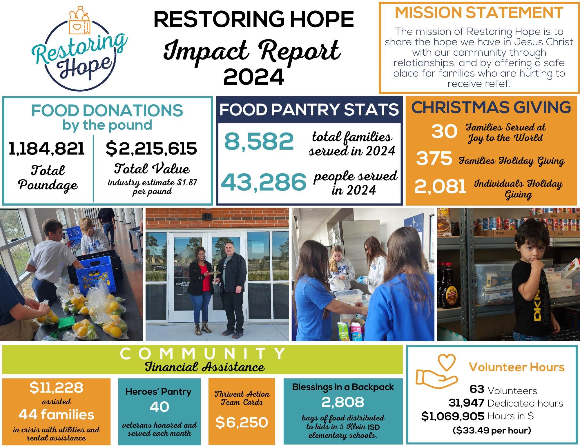You can help support the ministry of Restoring Hope and make an impact in the lives of those in need here in the Spring/Klein community. Click the button below to make a donation now.